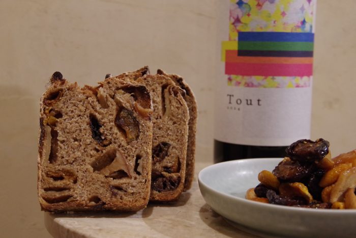 信州の白ワインに信州のフルーツを漬けて、カンパーニュ生地にたっぷりと混ぜ込みました。